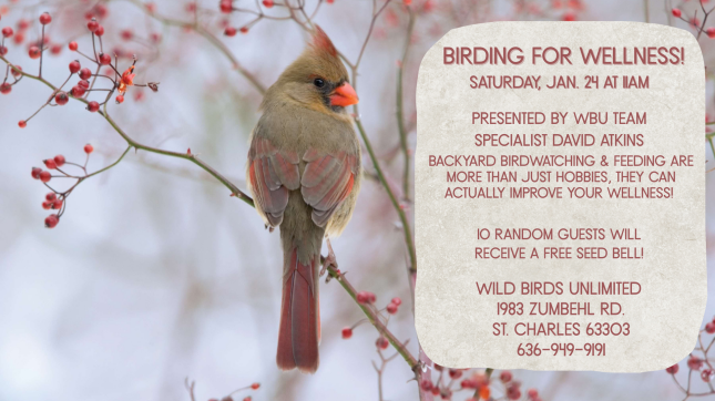 It has been proven that hobbies keeping your mind engaged help your health. Hobbies that provide a moment to relax and refresh are also beneficial. Team Specialist David Atkins will show you how birdwatching & feeding is the best combination of hobbies to boost your wellness! Discover various ways to start or expand your birding hobby based upon the benefits you wish to gain! We are giving away 10 bird seed bells, too! This event is free and all are welcome